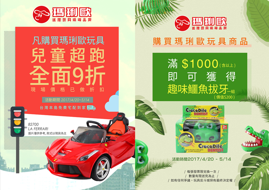 購買瑪琍歐玩具商品,滿$1000(含以上)即可獲得 "趣味鱷魚拔牙一組"(數量有限 敬請把握)