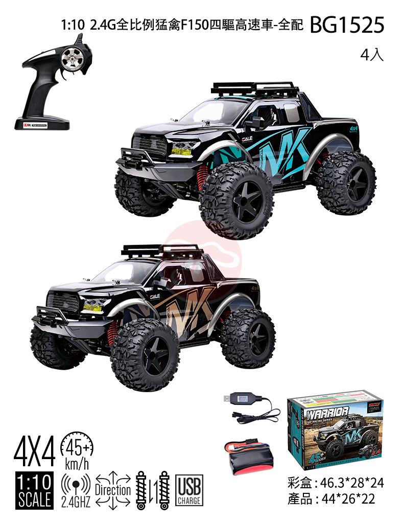 ●產品採用2.4GHz技術支援多架高速車同時竟速比賽,實現漂亮的高速越野漂移動作。