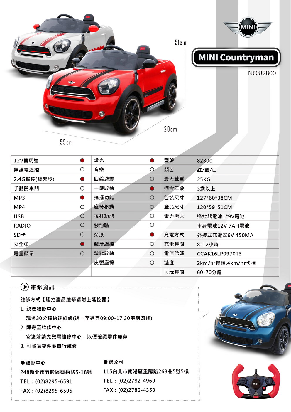 【型號82800】2.4G Mini Countryman 授權遙控童車