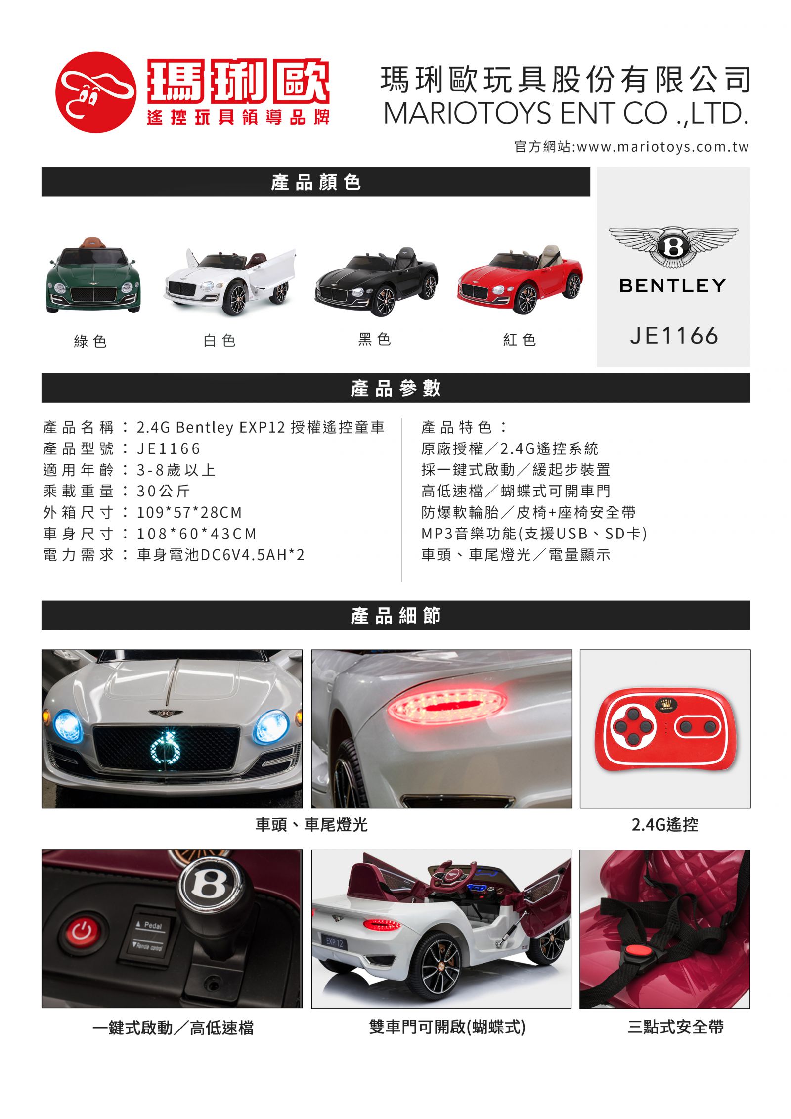 【型號JE1166】2.4G License car Bentley EXP12/電動童車